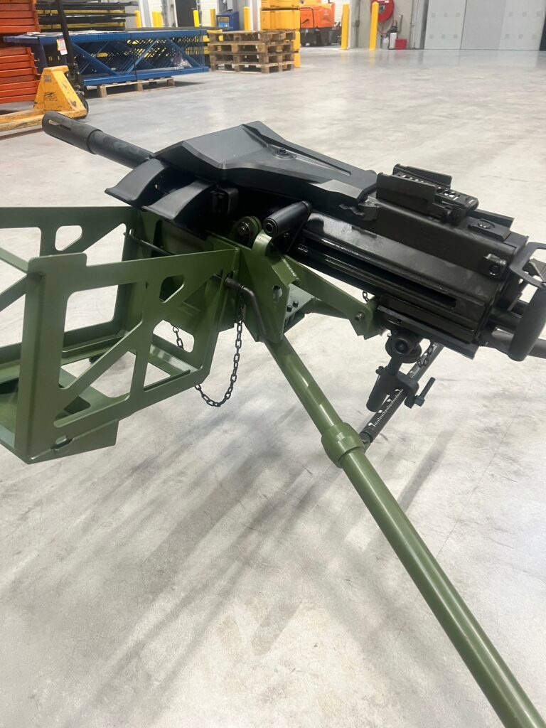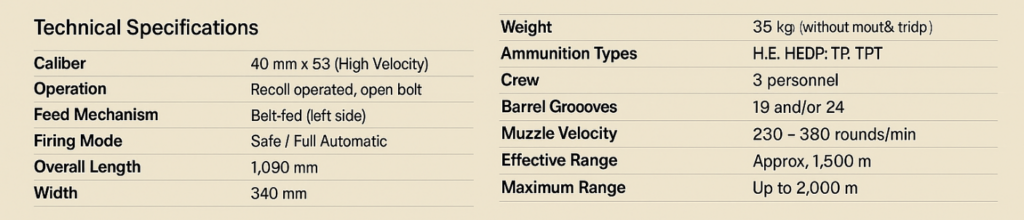 The AIA-AGL-40MM-Mk1-AUTO is a fully automatic, blowback-operated, air-cooled machine gun designed for sustained fire support. It can be deployed on a tripod for ground use or mounted on vehicles and boats using a standardized interface.